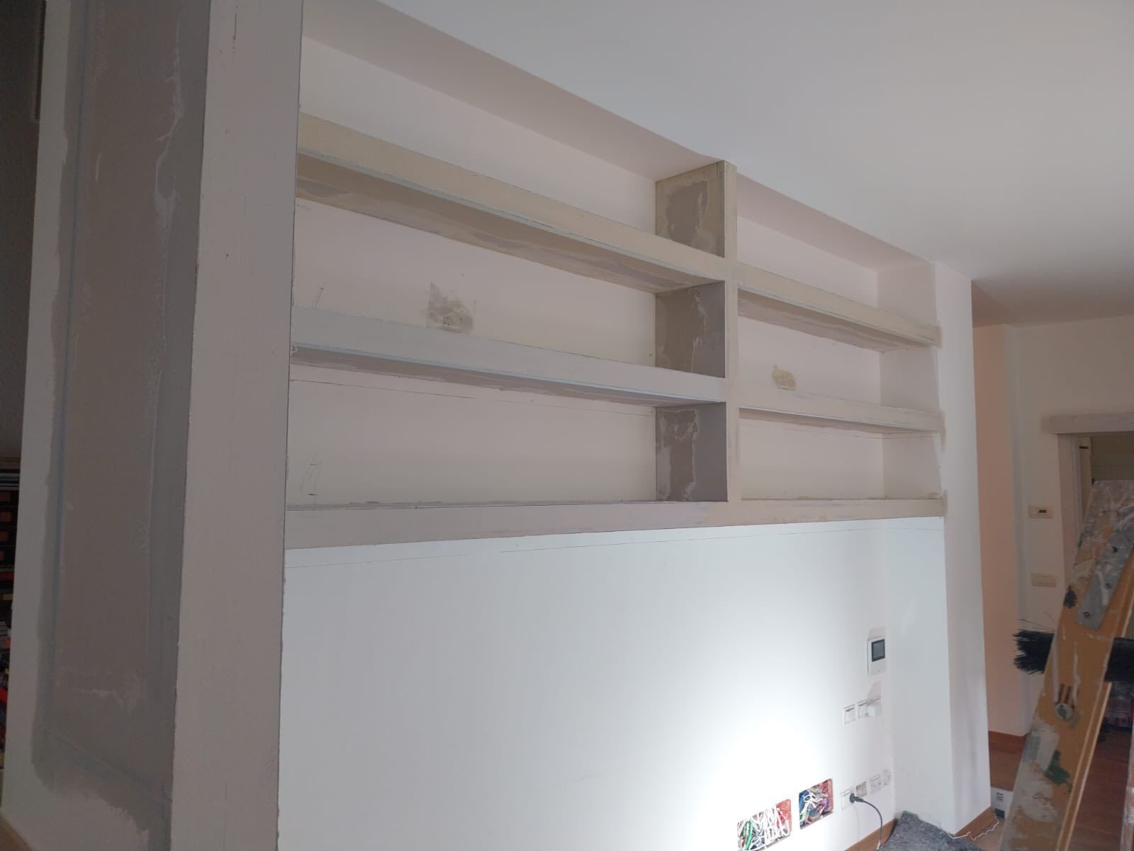 controsoffitti tecnici e decorativi, ideali per nascondere impianti, inserire sistemi di illuminazione a LED o creare giochi di volumi attraverso velette e ribassamenti. Realizziamo inoltre pareti divisorie ad alta resistenza, cabine armadio su misura e librerie integrate che trasformano pareti anonime in veri elementi d'arredo. Grazie alla nostra esperienza nelle finiture, ogni struttura in cartongesso viene trattata con stuccature a regola d'arte, eliminando ogni giuntura visibile e preparando la superficie a una tinteggiatura perfetta, garantendo una planarità che solo una posa professionale può offrire.